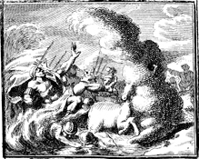 Description: The waves cover the Egyptians as the Israelites cross the Red (Reed) Sea on dry land. Engraving by Martin Bernigeroth (1670-1733) after the design of Samuel Bottschild (1641-1707).
