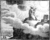 Description: Moses receives the Ten Commandments from God on Mt. Sinai. Engraving by Martin Bernigeroth (1670-1733) after the design of Samuel Bottschild (1641-1707).