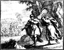 Description: Moses prepares to throw the tablets of the Ten Commandments down, as the people worship the golden calf. Engraving by Martin Bernigeroth (1670-1733) after the design of Samuel Bottschild (1641-1707).
