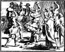 Description: The son of Shelomith is stoned for blasphemy as an illustration of the violation of the second commandment: "Thou shalt not take the name of the Lord thy God in vain". Engraving by Martin Bernigeroth (1670-1733) after the design of Samuel Bottschild (1641-1707).