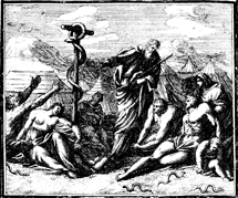 Description: Moses provides a bronze serpent that whoever looks upon it may survive the venomous snake bites. Engraving by Martin Bernigeroth (1670-1733) after the design of Samuel Bottschild (1641-1707).