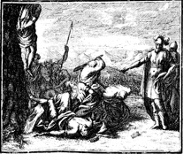 Description: Joshua has the five kings from Jerusalem, Hebron, Jarmuth, Lachish, and Eglon, who fought against Israel, slaughtered. Engraving by Martin Bernigeroth (1670-1733) after the design of Samuel Bottschild (1641-1707).