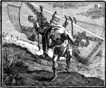 Description: Samson escapes a Philistine trap and carries away the city gates of Gaza. Engraving by Martin Bernigeroth (1670-1733) after the design of Samuel Bottschild (1641-1707).
