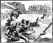 Description: David cuts off Goliath's head with the giant’s sword after felling him with a sling. Engraving by Martin Bernigeroth (1670-1733) after the design of Samuel Bottschild (1641-1707).