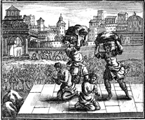 Description: The two elders who tried to blackmail Susanna are stoned for giving false witness. Engraving by Martin Bernigeroth (1670-1733) after the design of Samuel Bottschild (1641-1707).