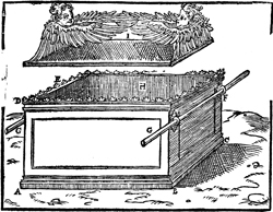 Description: The Ark of the Covenant with two poles made from acacia wood and two cherubim made of gold.