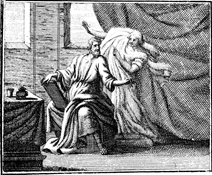Description: The Apostle Matthew writes his gospel as his evangelistic symbol, a human, stands behind him. Engraving by Martin Bernigeroth (1670-1733) after the design of Samuel Bottschild (1641-1707).