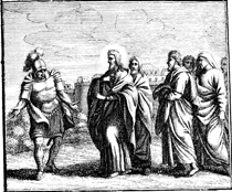 Description: Jesus heals the Centurion’s servant because of the Centurion’s great faith. Engraving by Martin Bernigeroth (1670-1733) after the design of Samuel Bottschild (1641-1707).