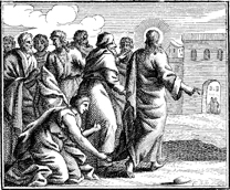 Description: A woman who had suffered from hemorrhages touches Jesus’ cloak, as he walks by, and is healed. Engraving by Martin Bernigeroth (1670-1733) after the design of Samuel Bottschild (1641-1707).