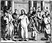 Description: Jesus teaches his disciples that childlike humility is needed to enter the Kingdom of Heaven. Engraving by Martin Bernigeroth (1670-1733) after the design of Samuel Bottschild (1641-1707).