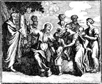 Description: Children come to Jesus, and Jesus says that it is they who will inherit the Kingdom of God. Engraving by Martin Bernigeroth (1670-1733) after the design of Samuel Bottschild (1641-1707).