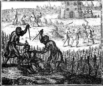 Description: The wicked tenants refuse to give the landowner his produce, beat his slaves, and then murder his son. Engraving by Martin Bernigeroth (1670-1733) after the design of Samuel Bottschild (1641-1707).