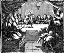 Description: Jesus partakes of the Passover with his disciples. Engraving by Martin Bernigeroth (1670-1733) after the design of Samuel Bottschild (1641-1707).