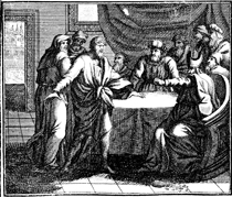 Description: Judas repents and returns the thirty pieces of silver to chief priests. Engraving by Martin Bernigeroth (1670-1733) after the design of Samuel Bottschild (1641-1707).