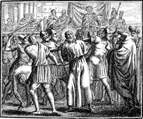 Description: Pilate releases Jesus to the crowd and symbolically washes his hands. Engraving by Martin Bernigeroth (1670-1733) after the design of Samuel Bottschild (1641-1707).