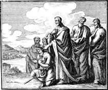 Description: Jesus cures a deaf man with a speech impediment by first putting his fingers in the man's ears, then spitting and touching the man's tongue while looking up into heaven and saying, "Be opened”. Engraving by Martin Bernigeroth (1670-1733) after the design of Samuel Bottschild (1641-1707).