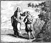 Description: Jesus heals a blind man in Bethsaida by putting saliva in his eyes. Engraving by Martin Bernigeroth (1670-1733) after the design of Samuel Bottschild (1641-1707).