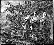 Description: Mary Magdalene, Mary the mother of James, and Salome find Jesus' tomb empty when they go to anoint his body for burial. Engraving by Martin Bernigeroth (1670-1733) after the design of Samuel Bottschild (1641-1707).