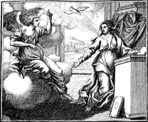 Description: The angel Gabriel visits Mary and announces that she will give birth to Jesus. Engraving by Martin Bernigeroth (1670-1733) after the design of Samuel Bottschild (1641-1707).