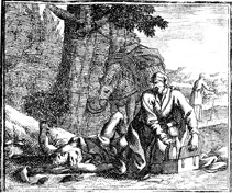 Description: A Samaritan stops to help a man wounded by thieves, while a priest and a Levite pass by. Engraving by Martin Bernigeroth (1670-1733) after the design of Samuel Bottschild (1641-1707).
