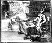 Description: The rich fool plans to build a bigger barn, not realizing that he will die that night. Engraving by Martin Bernigeroth (1670-1733) after the design of Samuel Bottschild (1641-1707).