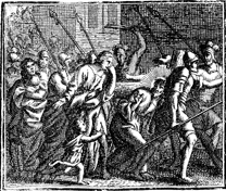 Description: Simon of Cyrene is pressed into service to help Jesus bear the cross to Golgotha. Engraving by Martin Bernigeroth (1670-1733) after the design of Samuel Bottschild (1641-1707).