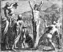 Description: Rulers mock Jesus, and soldiers offer him wine mixed with vinegar. Engraving by Martin Bernigeroth (1670-1733) after the design of Samuel Bottschild (1641-1707).