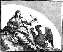 Description: The Apostle John writes his gospel as his evangelistic symbol, an eagle, sits beside him. Engraving by Martin Bernigeroth (1670-1733) after the design of Samuel Bottschild (1641-1707).