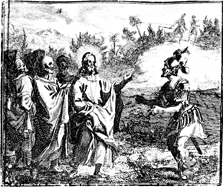Description: Jesus tells the official that his son has been made well, while in the background the official is greeted by his slaves who confirm this news. Engraving by Martin Bernigeroth (1670-1733) after the design of Samuel Bottschild (1641-1707).