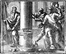 Description: Jesus is nearly stoned by the Pharisees in the temple for blasphemy. Engraving by Martin Bernigeroth (1670-1733) after the design of Samuel Bottschild (1641-1707).