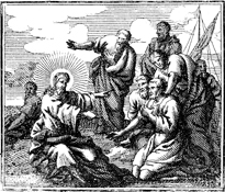 Description: Jesus asks Peter if he loves him, and instructs him to feed his sheep. Engraving by Martin Bernigeroth (1670-1733) after the design of Samuel Bottschild (1641-1707).