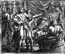 Description: Stephen preaches a sermon in response to the questions of the High Priest, after which he is stoned by the people. Engraving by Martin Bernigeroth (1670-1733) after the design of Samuel Bottschild (1641-1707).
