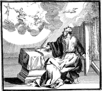 Description: Paul writes his epistle to the Romans, as images of the Holy Spirit and the crucifixion appear above. Engraving by Martin Bernigeroth (1670-1733) after the design of Samuel Bottschild (1641-1707).