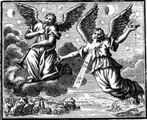 Description: At the sounding of the fourth trumpet the sun, moon, and stars are struck, and an angel cries out "Woe, Woe, Woe". Engraving by Martin Bernigeroth (1670-1733) after the design of Samuel Bottschild (1641-1707).