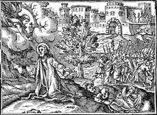 Description: As the disciples sleep, Jesus prays that his cup may pass (front). In the rear, Jesus is arrested.