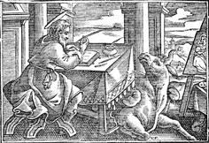 Description: Luke writes his gospel with his attribute, the bull, nearby.