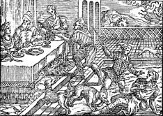 Description: Lazarus sits at the gate of the rich man, who lives in luxury. In the rear, the rich man begs Abraham to allow Lazarus to put water on his tongue to quench his torment.