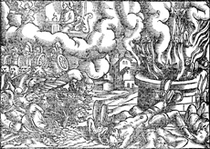Description: An angel sounds the fifth trumpet, causing a star to fall from heaven and open the Abyss, allowing locust-like creatures to prey upon the earth (right). An angel sounds the sixth trumpet and causes the attack of an army of angels and lion-like horses (left).