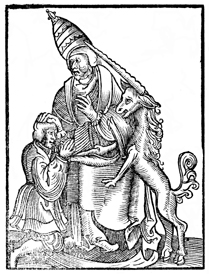 Description: As the Pope gives a blessing, a unicorn knocks his crown off his head.