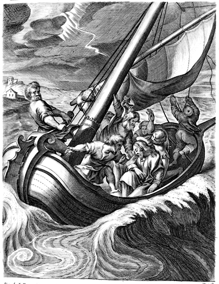 Description: Jesus sleeps in the boat while a storm threatens to sink it. The Apostles, frightened, awake Jesus, who stills the storm.
