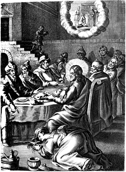 Description: Jesus is anointed by a sinful woman in the house of Simon the Pharisee, as he tells Simon a story of two debtors whose debts were forgiven.
