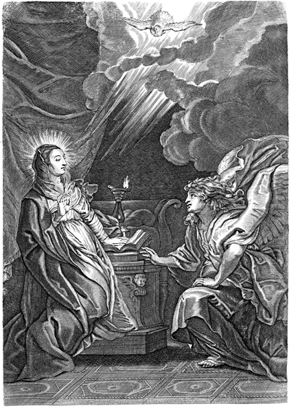 Description: The angel Gabriel visits Mary and announces that she will give birth to Jesus.