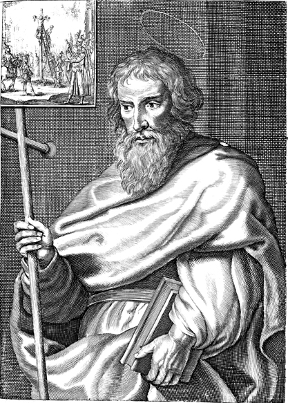 Description: A portrait of Philip, one of the twelve apostles, holding a Tau Cross, his attribute. In the upper right-hand corner is a scene depicting Philip’s martyrdom on a Tau cross.