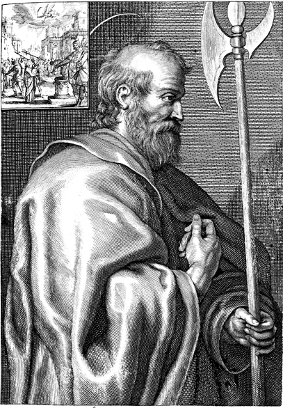 Description: A portrait of Saint Matthew, one of the twelve apostles, holding an axe, the instrument of his martyrdom. In the upper left-hand corner is a scene of Matthias’ martyrdom, where he was beheaded.