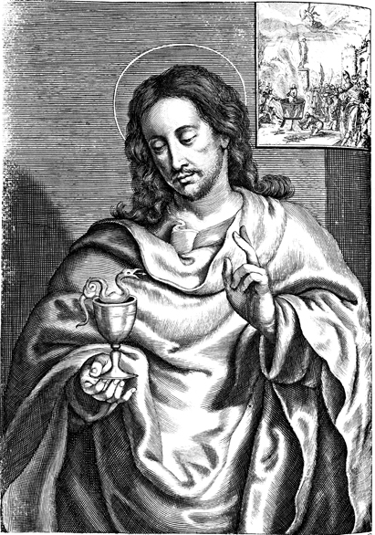 Description: A portrait of John, one of the twelve apostles, holding a cup with a serpent, his attribute. In the upper right-hand corner is a scene depicting the attempted martyrdom of John, during which he was lowered into a cauldron of boiling oil with no harm being done to him.