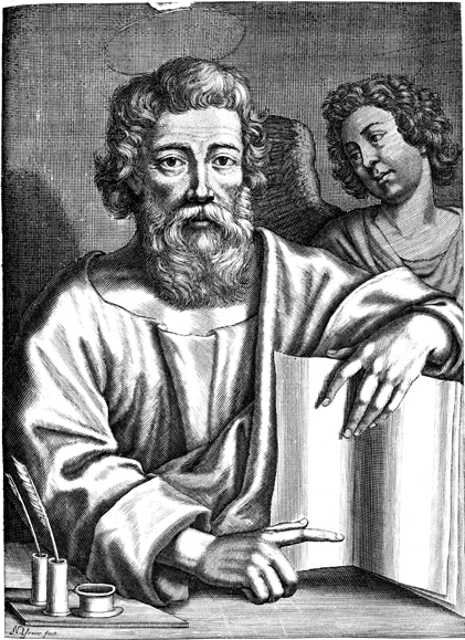 Description: A portrait of Matthew with his gospel and his attribute, a winged man, looking over his shoulder.