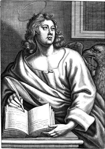 Description: A portrait of Saint John the Evangelist writing his gospel with his attribute, an eagle, looking over his shoulder.