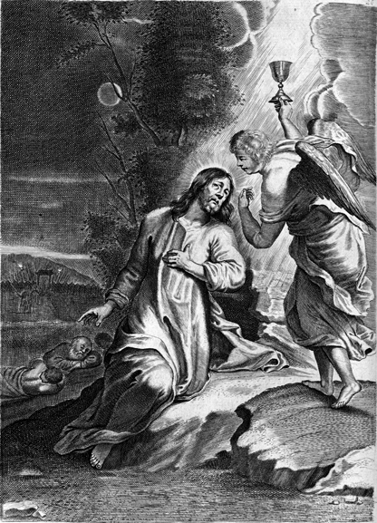 Description: Jesus prays in the Garden of Gethsemane as angels minister to him and the disciples sleep.