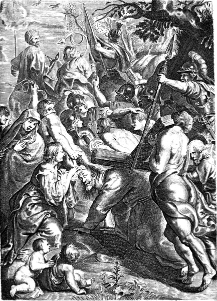 Description: Simon of Cyrene is pressed into service to help Jesus carry the cross to Golgotha.