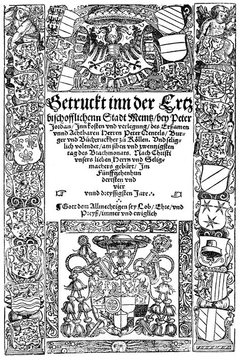 Description: This historiated title-page border features cherubs and several coats of arms. At the top is the coat of arms of Ferdinand of Austria, King in Germany (r. 1531-1564) and the Archduke of Austria (r. 1521-1564). Around the arms is the Order of the Golden Fleece, an order of chivalry. At the bottom are the arms of Albert of Mainz, the Archbishop-Elector of Mainz (r. 1514-1545), Bishop of Halberstadt (r. 1513-1545), and Archbishop of Magdeburg (r. 1513-1545).